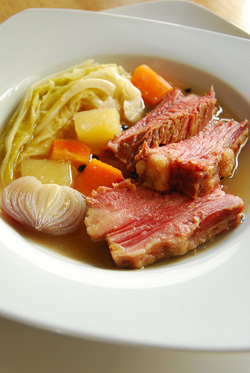 - Fish the slab of corned beef out onto a chopping board and slice thickly. Lay the slices on serving bowls and cover with the soup and a portion of vegetables. Enjoy hot.
